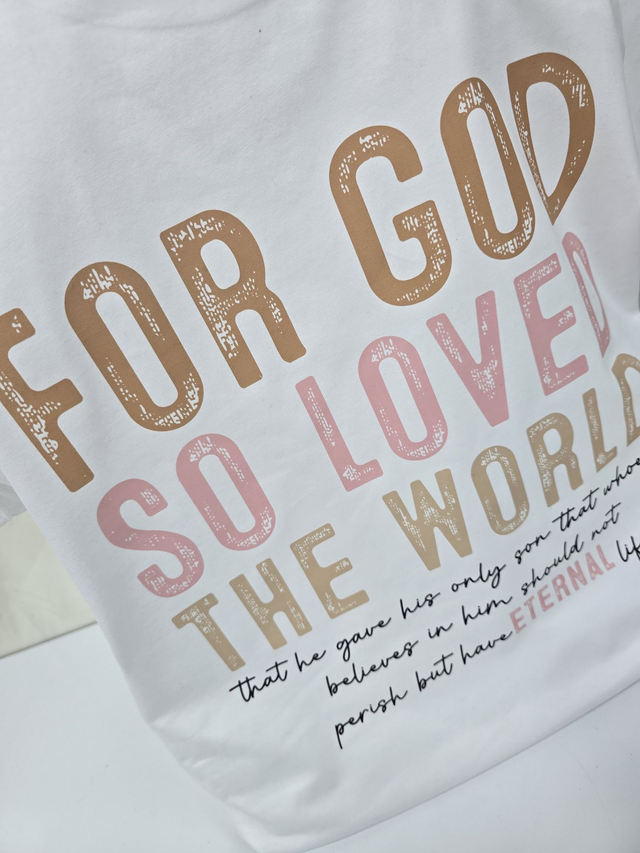 Celebrate faith and style with our "For God So Loved The World" T-shirt, inspired by John 3:16. This brands favourite is designed specifically for ladies who want to express God’s love boldly and beautifully. Made from soft, breathable fabric, it offers all-day comfort whether at church, school, or casual outings. The scripture print serves as a powerful reminder of God’s unconditional love, making it a meaningful addition to your wardrobe or a thoughtful gift for loved ones. Perfect for everyday wear, this T-shirt combines inspiring expression with trendy style—wear your faith confidently and share the message that matters most.